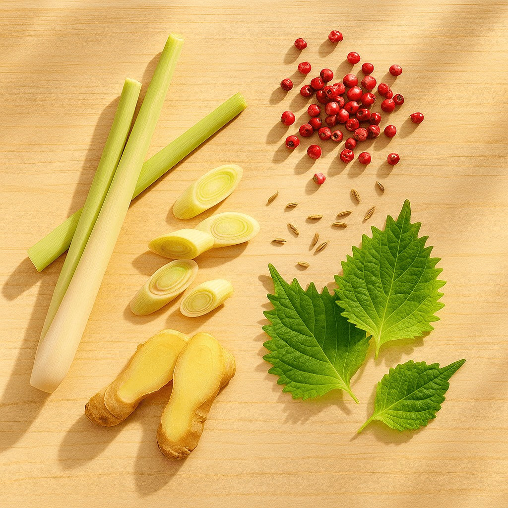 Shiso’s unique, slightly anise-like flavor adds brightness while soothing the digestive system. Rich in antioxidants and aromatic compounds, it supports gut comfort and brings a green, vibrant freshness to the blend.