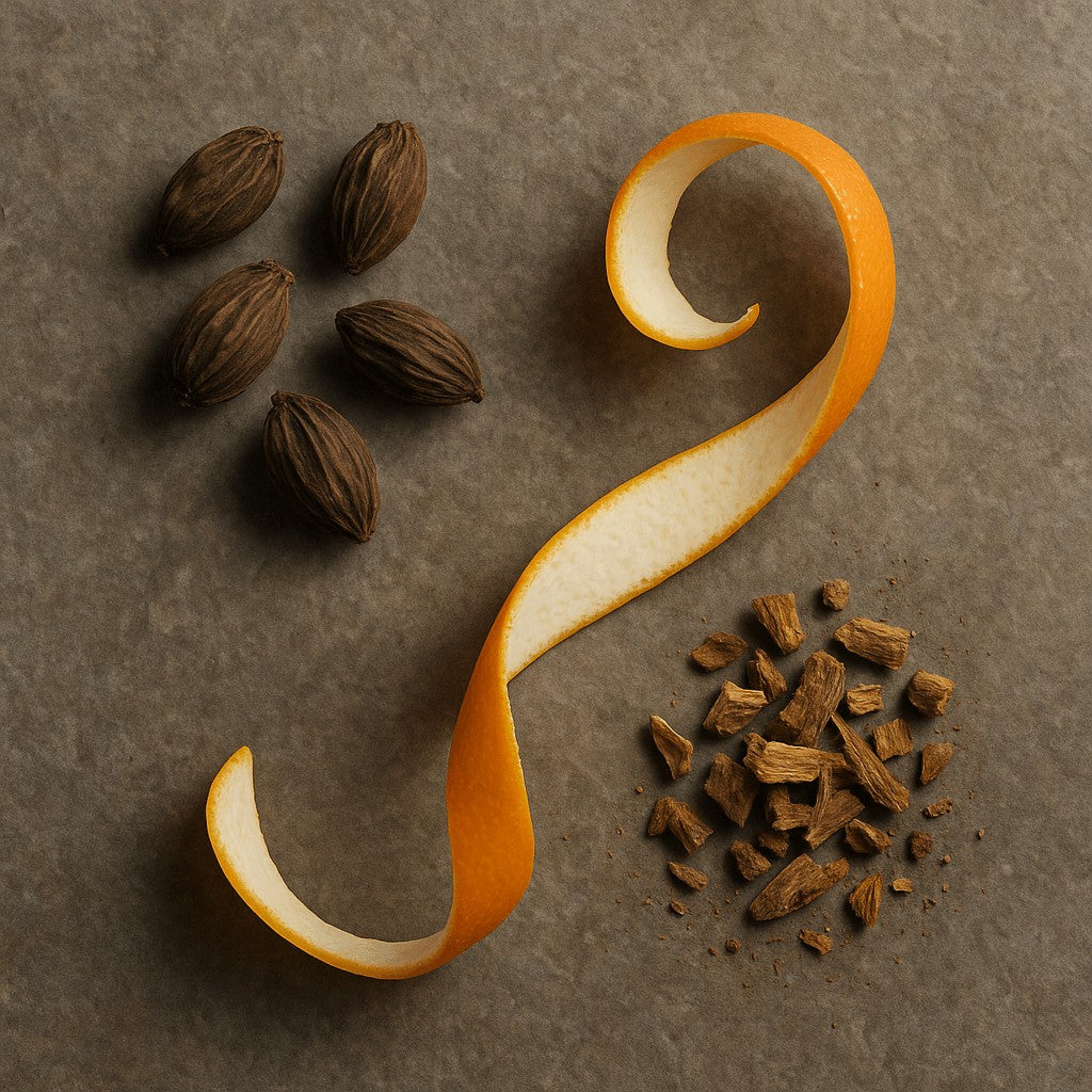 Orange peel cuts through richness with a gentle citrus lift. Traditionally valued for easing sluggish digestion, it offers aromatic brightness that balances the smoky spice and rounds the profile with a refreshing, cleansing finish.
